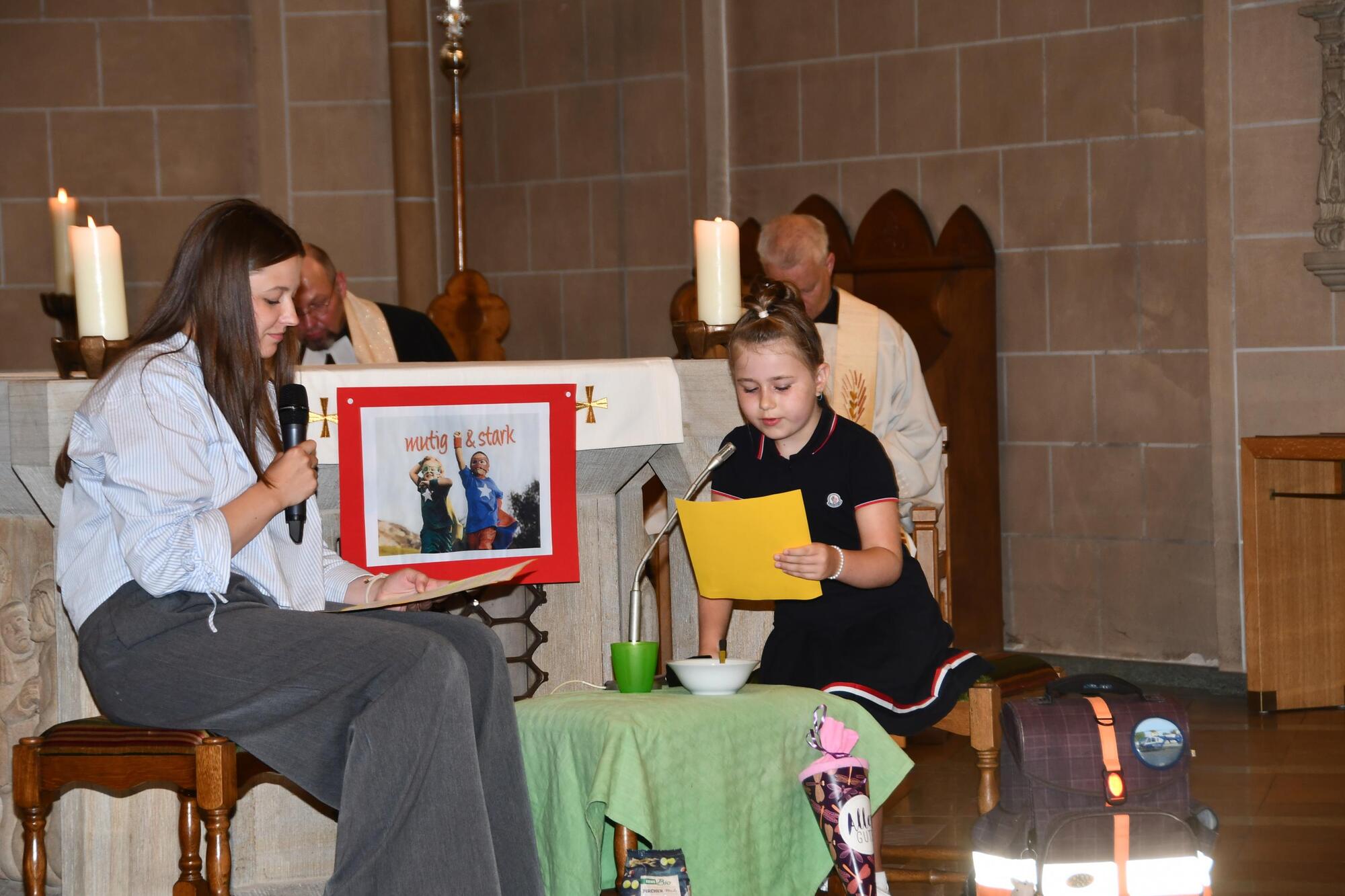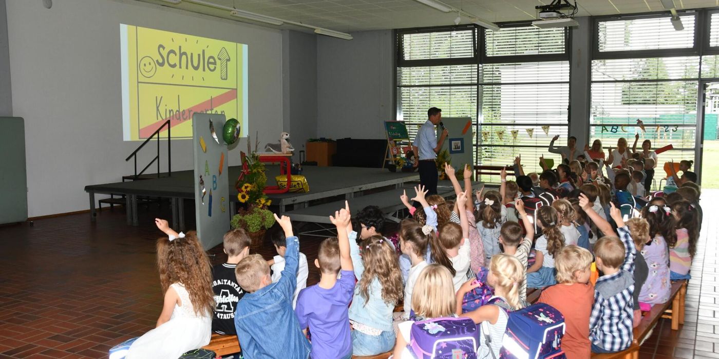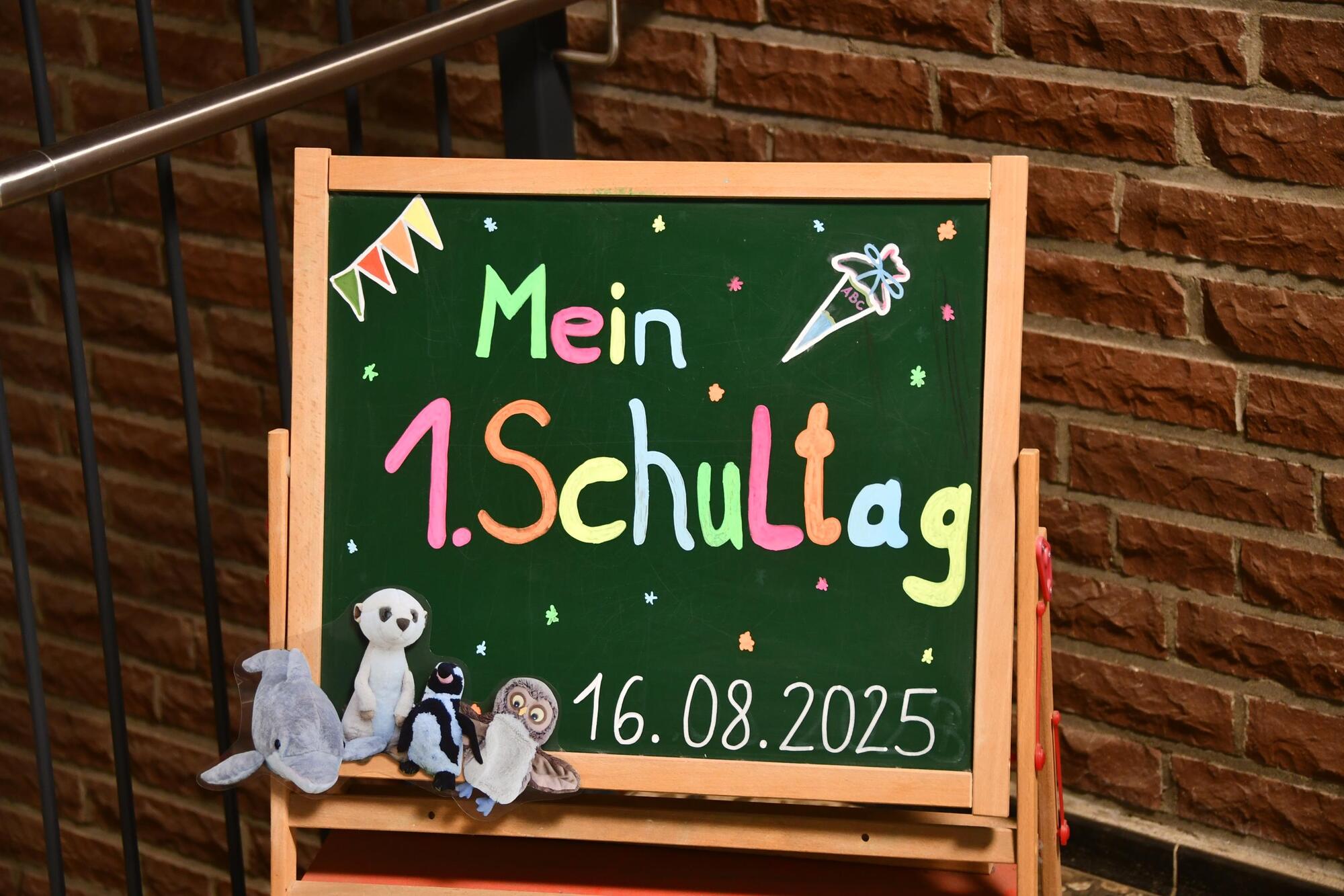Am Samstag, dem 16.08.2025 wurden die neuen Erstklässler und Schulkindergartenkinder eingeschult. Die Aufregung war spürbar, als sich zu Beginn der Feier deren Familien zu einem ökumenischen Gottesdienst in der St. Cyriakuskirche trafen. Pastor Marcus Droste und Pfarrer Karlheinz Fischer leiteten diesen. Einige Kinder aus den dritten Klassen gestalteten diesen mit und lieferten kleine Einblicke in das bunte Schulleben. Angelina aus der Klasse 3c spielte zusammen mit Frau Kutzera ein kleines Theaterstück zum Thema Einschulung vor. Im Anschluss hieß Schulleiter André Steinforth die neuen Schüler und deren Familien mit einer Geschichte in der Schulaula willkommen. Es wurde ein Video gezeigt, welches die Schüler aus dem Jahrgang 2 aufgenommen hatten, um die Neuankömmlinge zu begrüßen und ihnen Vorfreude auf die Schulzeit zu machen. Dann ging es zur ersten Unterrichtsstunde in die Klassenräume. Als die Eltern am Ende ihre Kinder auf dem Schulhof wieder in Empfang nahmen, konnte man viele strahlende und erleichterte Kinderaugen sehen. Die Schulgemeinschaft wünscht allen neuen Mitgliedern einen guten Start!