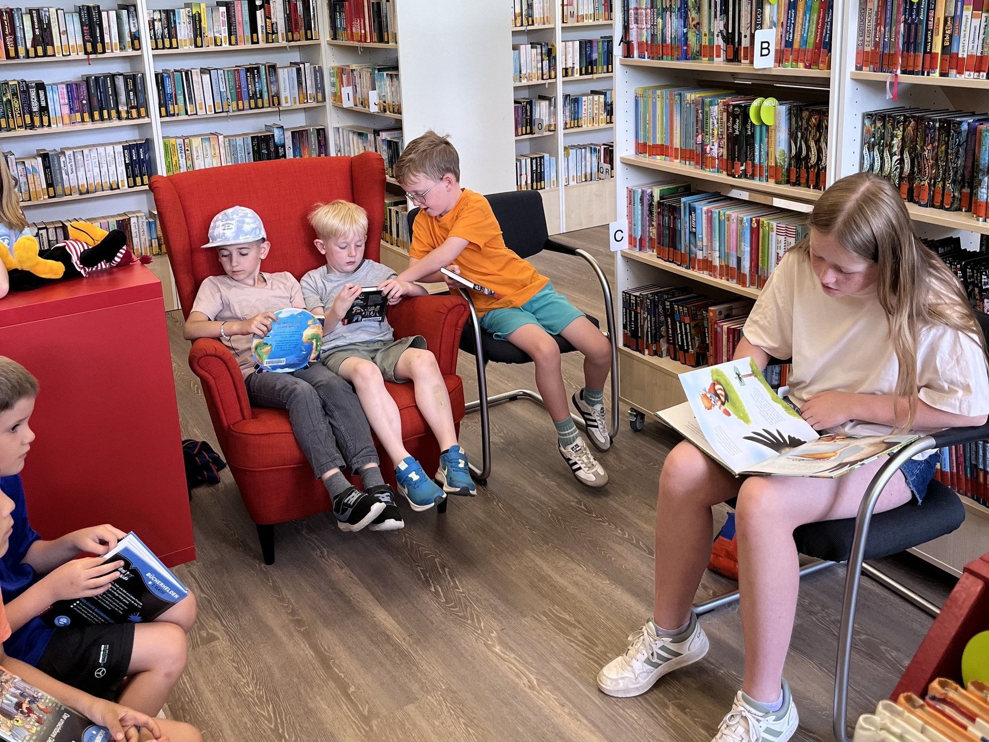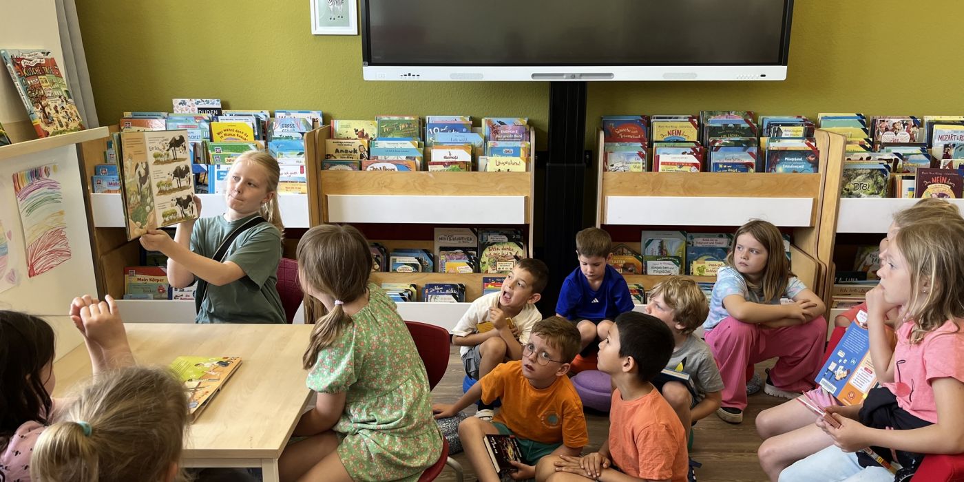 Am 18. und 19. Juni machten sich unsere Erstklässler mit ihren Klassenlehrerinnen auf den Weg zur Bücherei St. Cyriakus. Allen Kindern war die Bücherei bereits aus dem Kindergarten bekannt. So war es sowohl für die Mitarbeiterinnen als auch für die Kinder ein Wiedersehen - mit einem entscheidenden Unterschied: Jetzt können alle lesen! Aufgeregt haben die Kinder die für sie passenden Bereiche erkundet und spannende Bücher gefunden. Ein erstes Einlesen konnte in den gemütlichen Sitzecken der Bücherei erfolgen, und auch einige Vorleseproben kamen nicht zu kurz. Am Ende durfte sich jedes Kind ein Buch ausleihen und in den letzten Schultagen vor den Sommerferien in der Schule lesen.