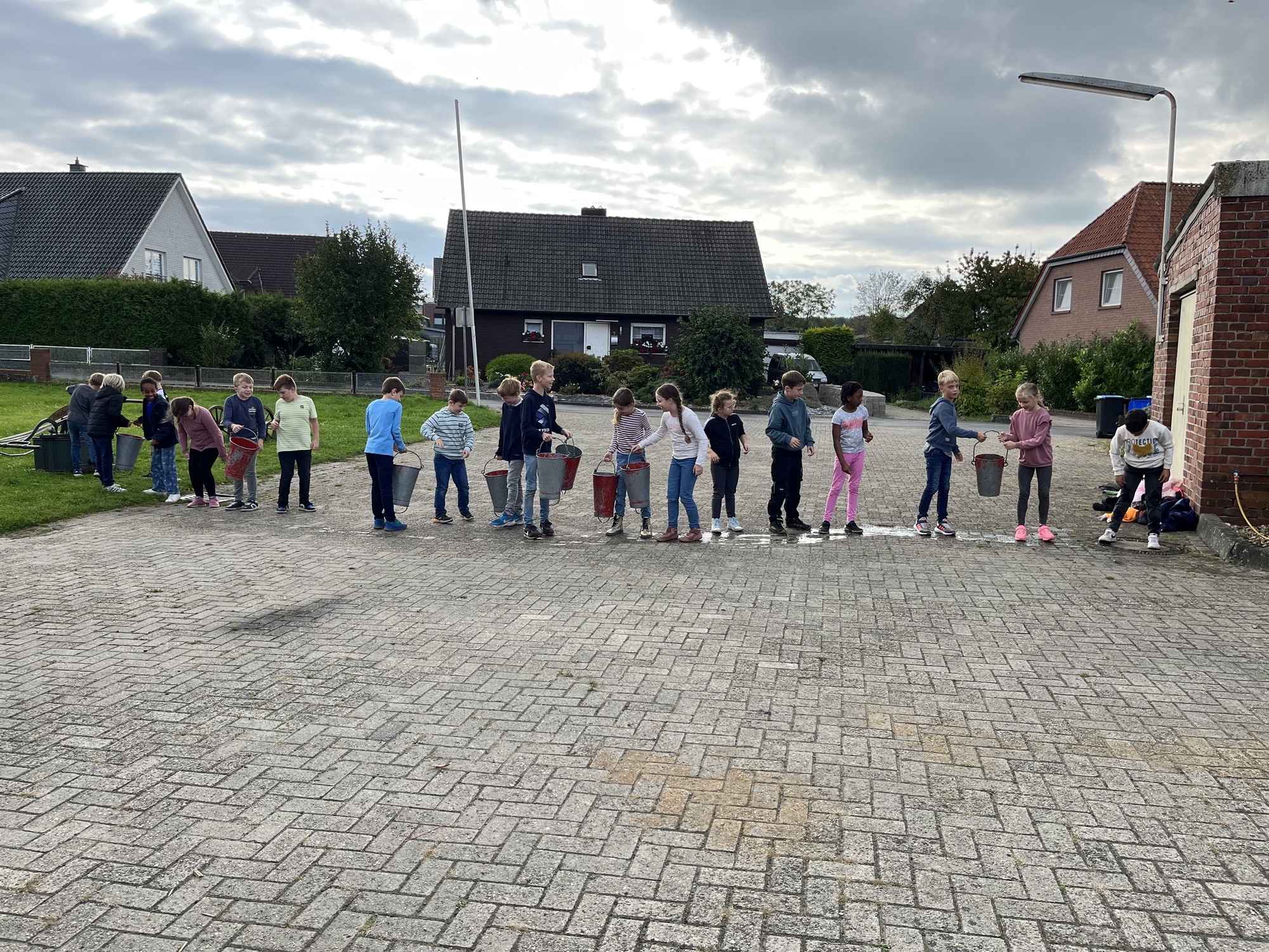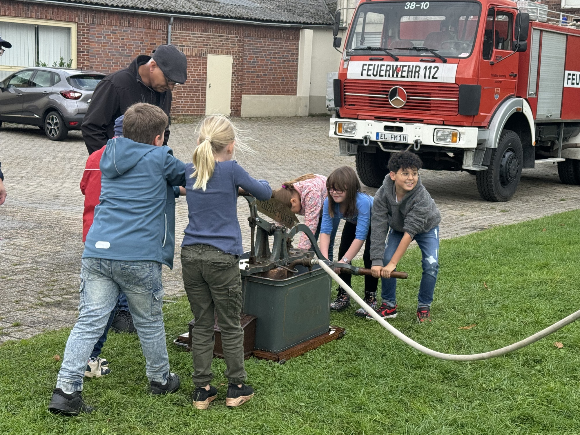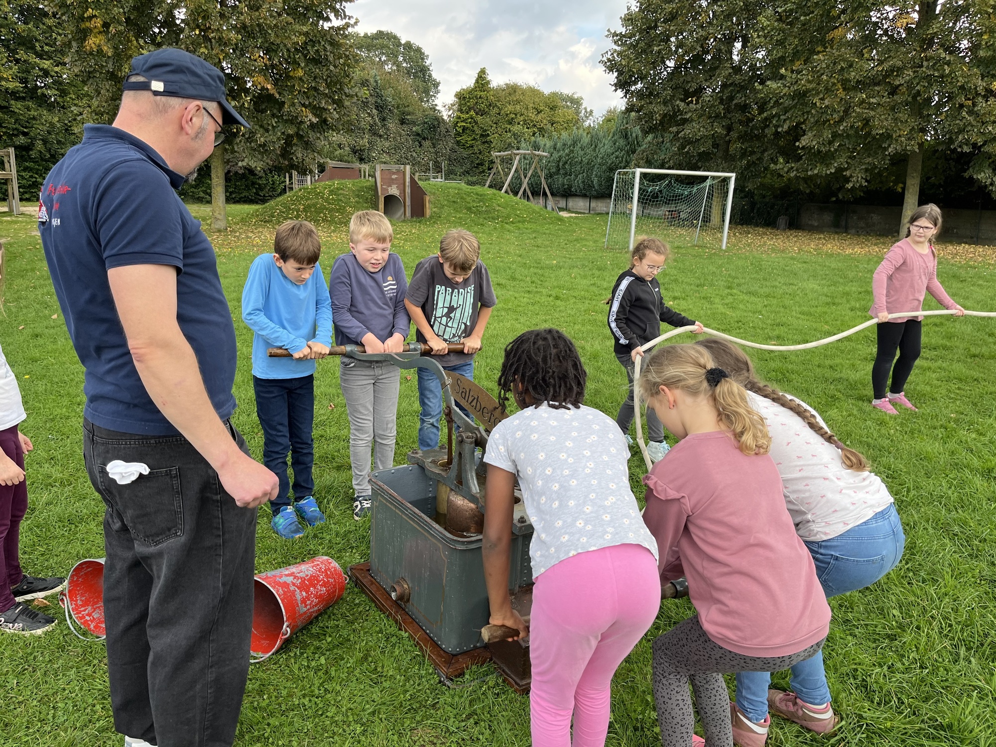 Pastor Marcus Droste nahm sich viel Zeit und versetzte die Kinder in verschiedene Jahrzehnte der Brandschutzgeschichte. Wuchtige Fahrzeuge, nützliche Gerätschaften, historische Schutzbekleidungen oder Atemschutzmasken brachten die Klassen 3a, 3b und 3c zum Staunen. Besonders motiviert waren die Kinder bei der Umsetzung einer Eimerkette, die einer kleinen Löschaktion diente.