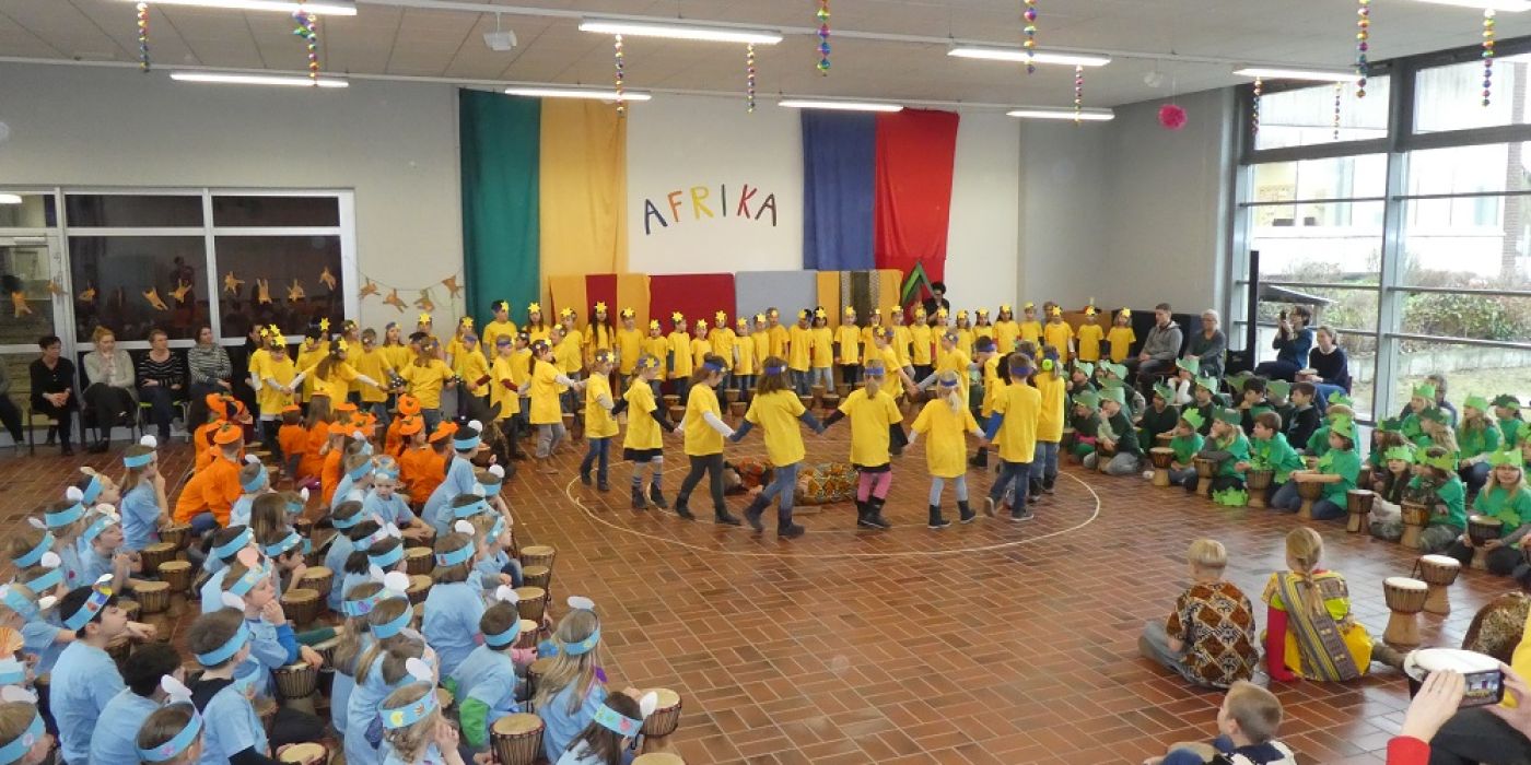 Täglich traf sich die gesamte Schulgemeinschaft zum gemeinsamen Trommeln, Singen und Tanzen in der Sporthalle oder der Aula. Ganz beiläufig wurden dadurch die Lieder, Tänze und Trommelrhythmen für das abschließende Theaterstück am Freitag erlernt. Neben diesen gemeinsamen Übungsstunden beschäftigten sich die Schüler in ihren Klassen mit der Herstellung ihrer Kostüme und dem Thema Afrika. So waren beispielsweise die bekannten Tiere aus Afrika Inhalt der Klassenstunden oder auch die Lebensverhältnisse und die Geographie des fremden Kontinents.