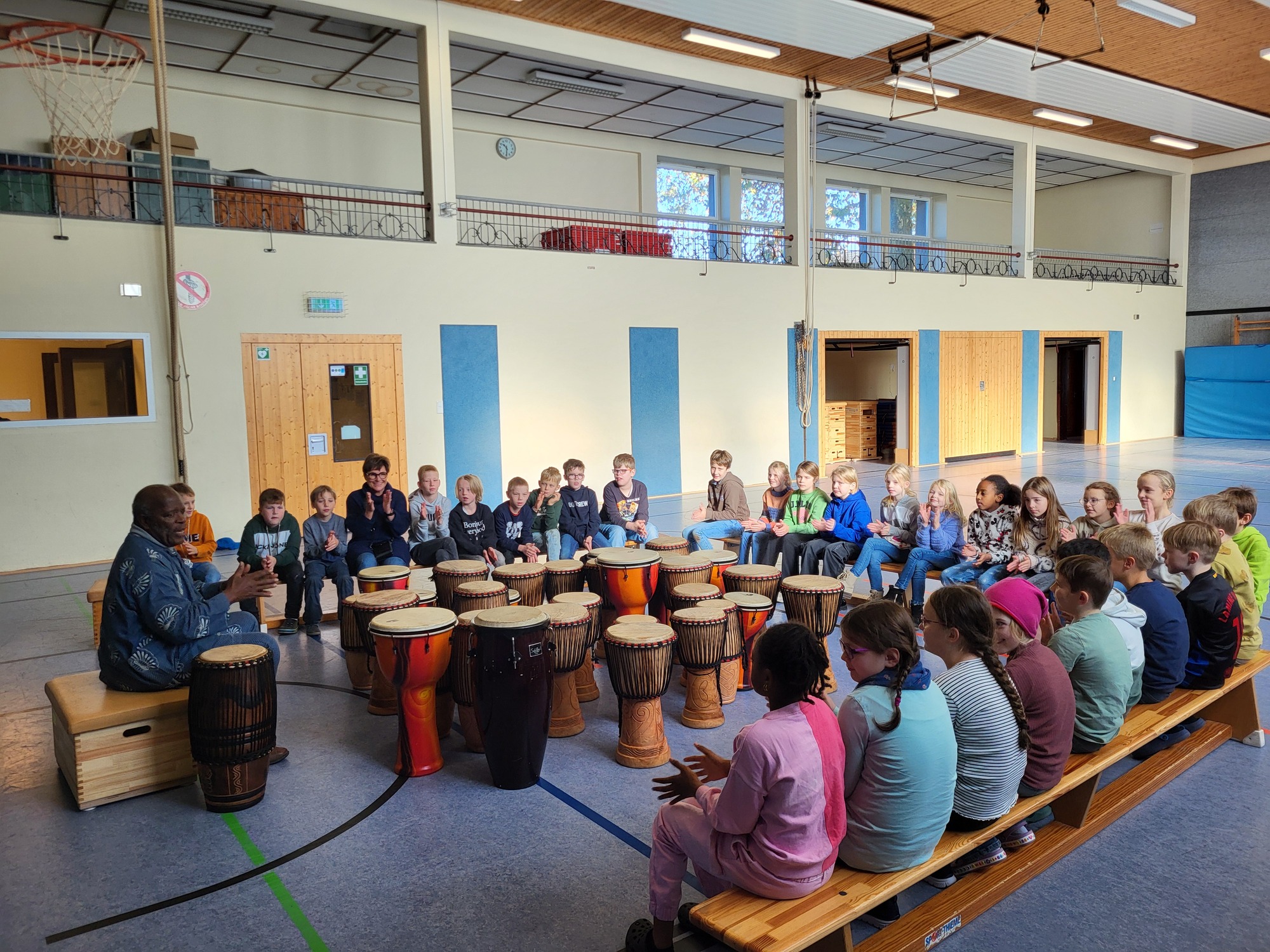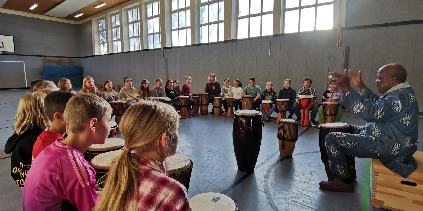 Am 04.11. und 08.11. besuchten uns Musikprofessor Morphius aus Ghana und sein Sohn Michael. In Gruppen von etwa 30 Kindern trommelte die gesamte Schulgemeinschaft bis ihnen warm ums Herz wurde. Die beiden afrikanischen Trommellehrer versprühten die reinste Lebensfreude und sorgten für gute Stimmung bei Jung und Alt. Gleichzeitig unterstützen wir als Grundschule Salzbergen das Hilfsprojekt der beiden in ihrem Heimatland Ghana. Das “Centre for Talent Expression” in Winneba (Ghana) ist eine vom Musikprofessor Morphius Eurapson-Quaye als Ausbildungszentrum gegründete NGO-School, die für ihre Arbeit ganz auf Spendenmittel angewiesen ist. Der Förderverein der Grundschule Salzbergen spendete die großzügige Summe von 1000 Euro.