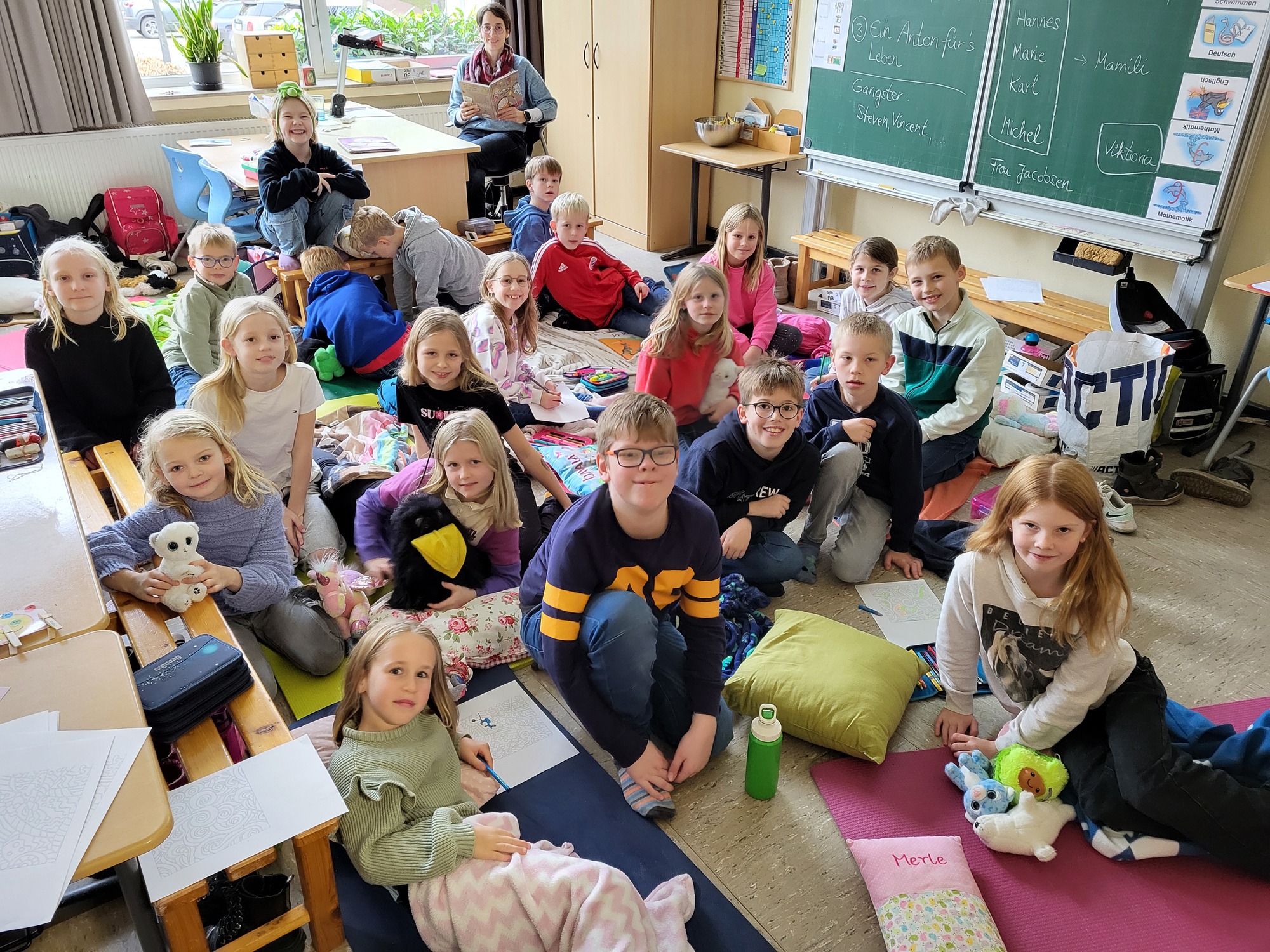 Am 15. November wurde in unserer Schule wieder überall vorgelesen. Grund dafür war der internationale Vorlesetag. In der dritten und vierten Stunde wurden in allen Klassenräumen Decken, Kissen und Kuscheltiere aus den Taschen geholt und alle machten es sich gemütlich. Die Lehrerinnen und Lehrer lasen aus den verschiedensten Büchern vor. Die Kinder genossen die gemütliche Zeit sehr.