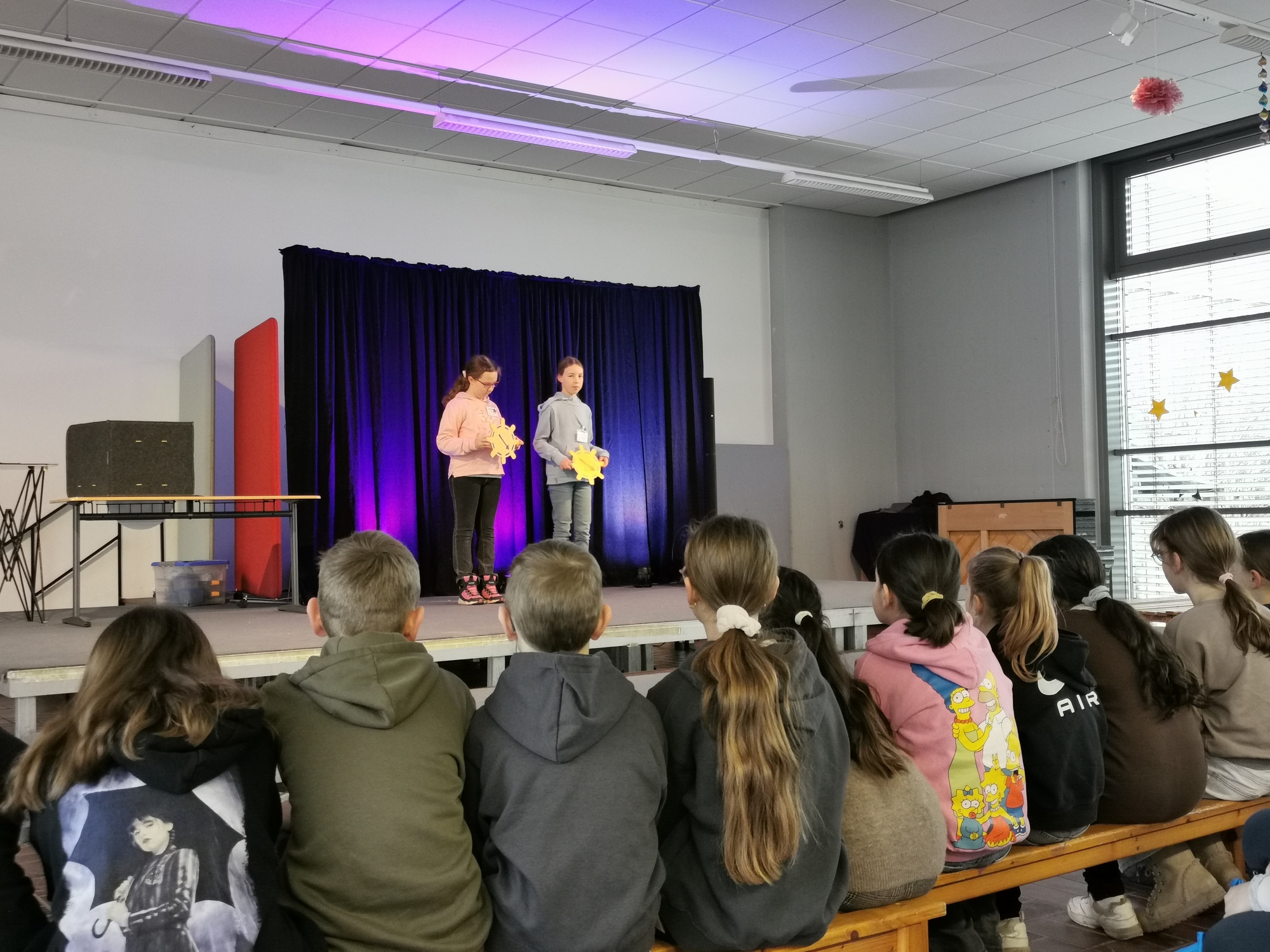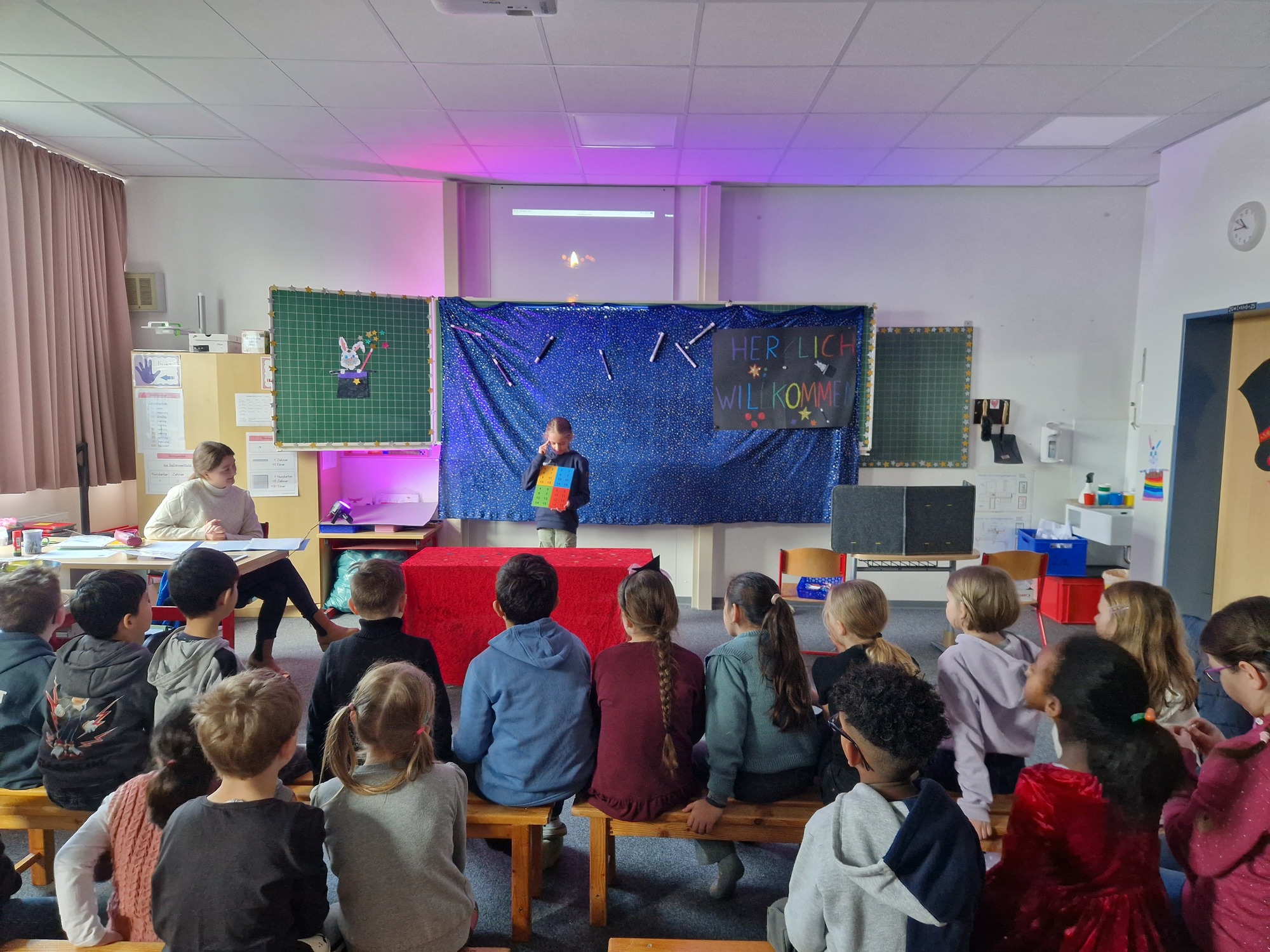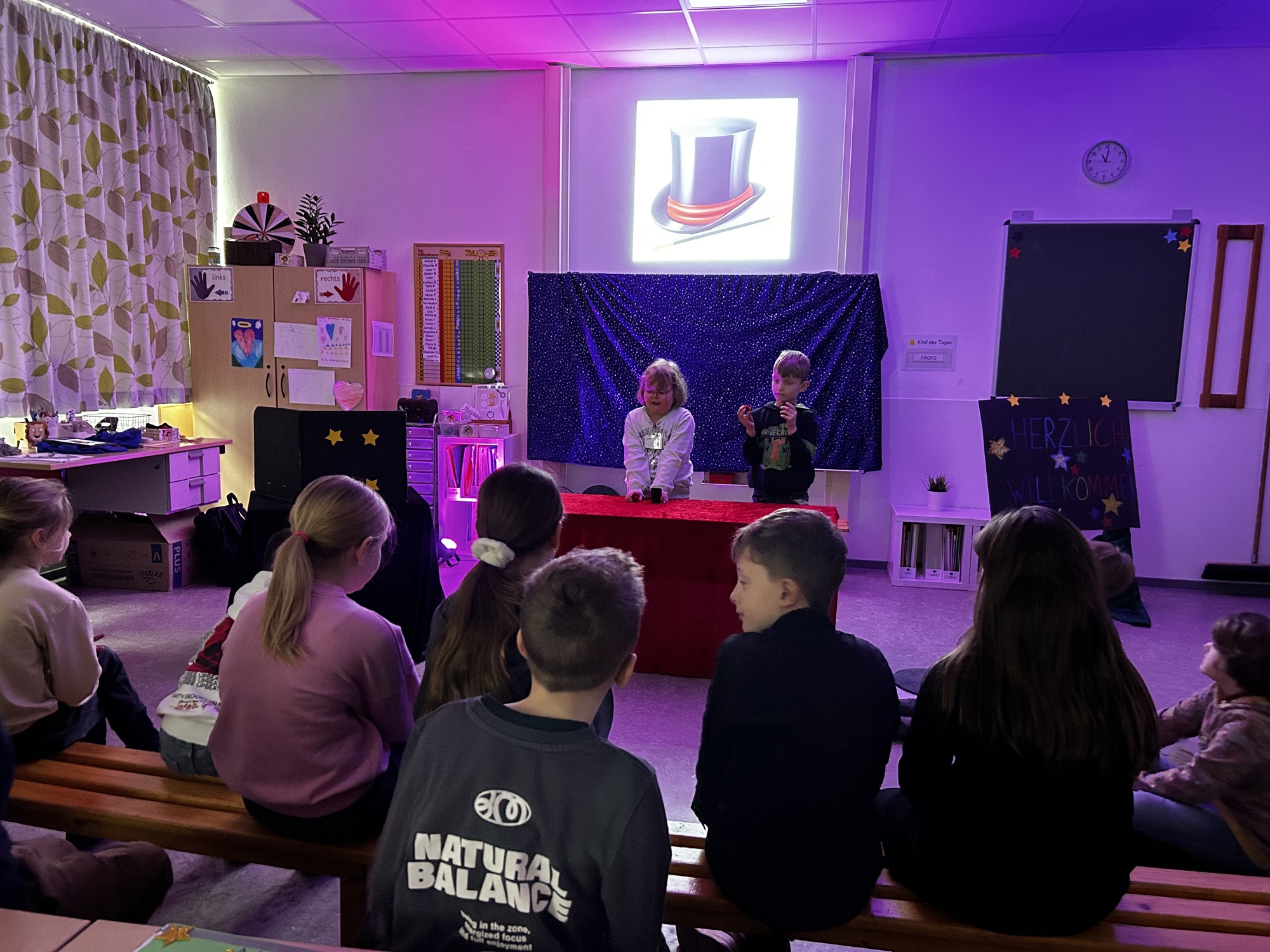 Das große Finale fand dann schließlich am Freitag statt. Für die einzelnen kleinen Zaubershows wurden alle Kinder jahrgangsübergreifend gemischt. Die Kinder konnten dann die unterschiedlichen, erlernten Tricks zeigen und ein abwechslungsreiches Programm präsentieren. Eltern, Verwandte und Bekannte bildeten dann nachmittags das Publikum. Sie waren sichtlich überrascht, als Gegenstände teleportiert wurden, Gedanken gelesen wurden oder Karten sich während des Zusehens veränderten. Die Kinder haben, trotz teils großer Aufregung, eine beeindruckende Show geboten. Die Zuschauer waren sichtlich begeistert und spendeten am Ende den wohlverdienten Riesenapplaus.
