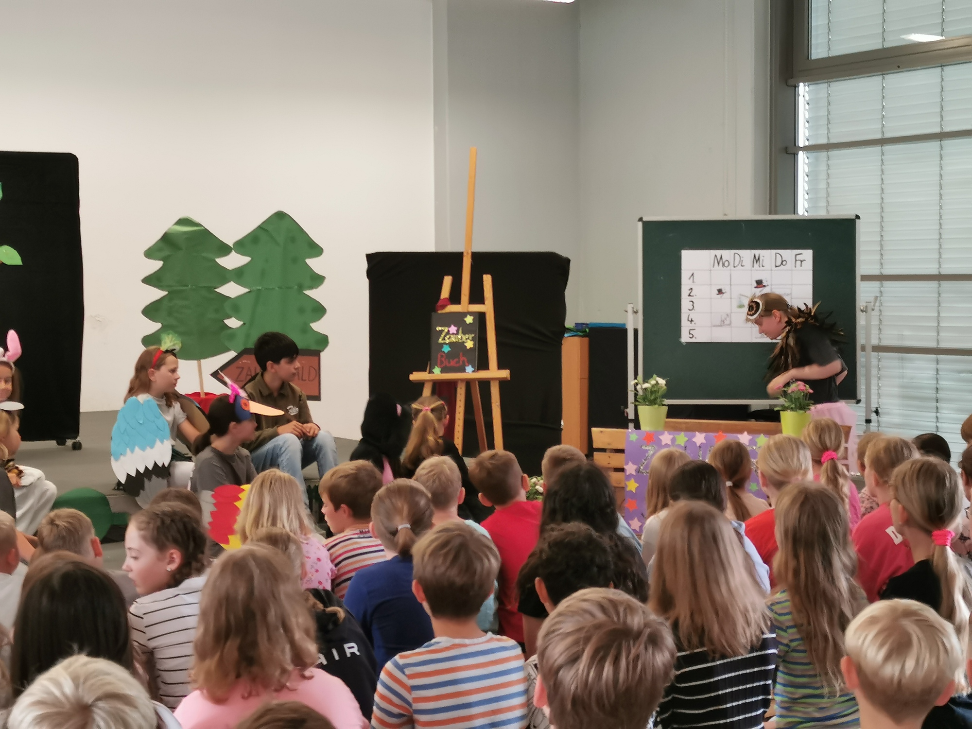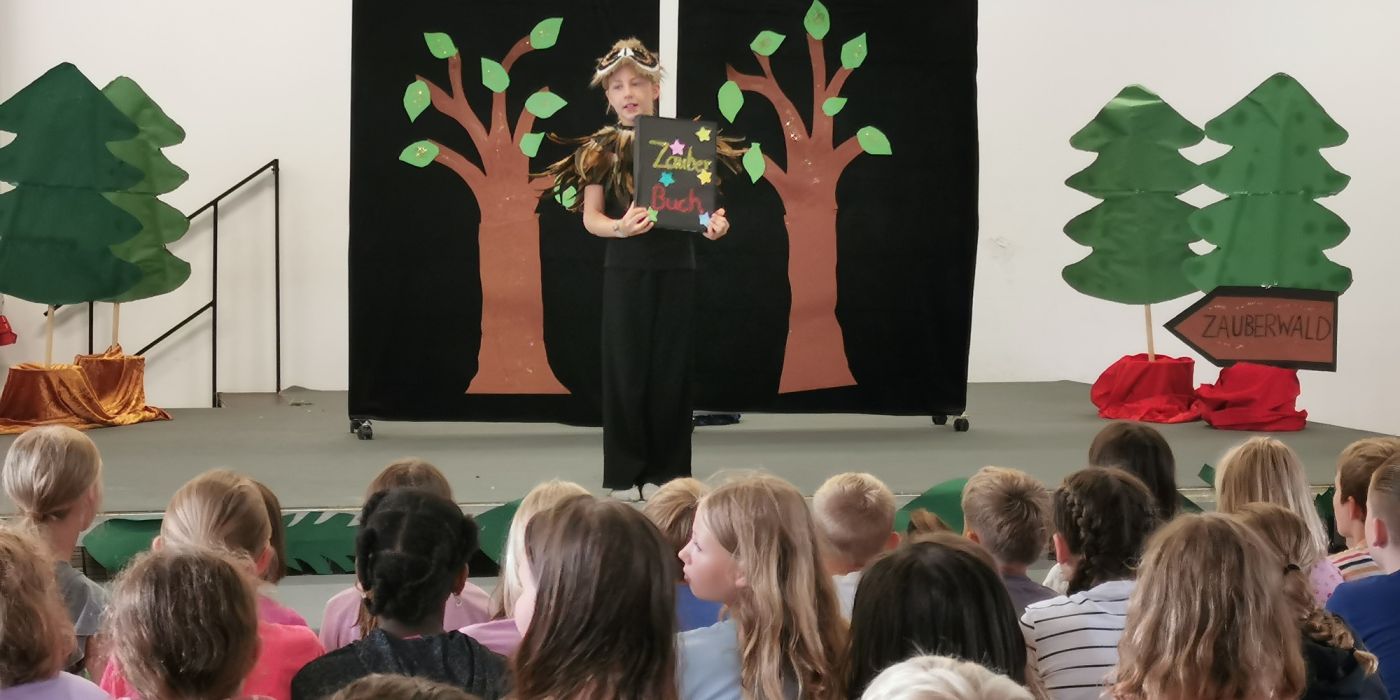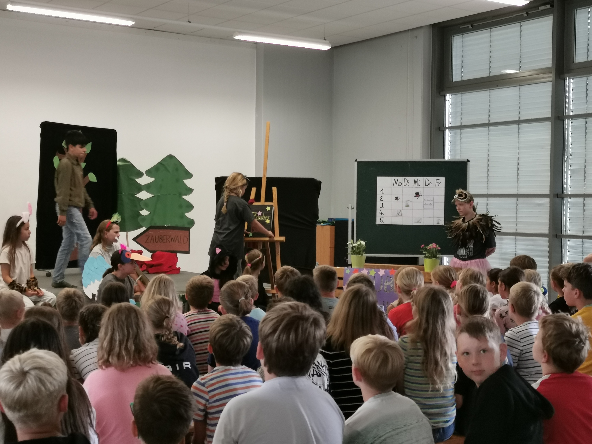 Die Theater-AG, unter der Leitung von Frau Kutzera, führte ein Stück auf, was sich um ein gestohlenes Zauberbuch drehte. Dieses wurde aus der magischen Schule der Tiere gestohlen. Die Schildkröte wurde als Täter verdächtigt und machte sich mit einigen Helfern auf die Suche nach den wahren Dieben, auch um die eigene Unschuld zu beweisen. Schließlich wurden sie bei den Vögeln fündig und konnten das Buch zurückbringen.