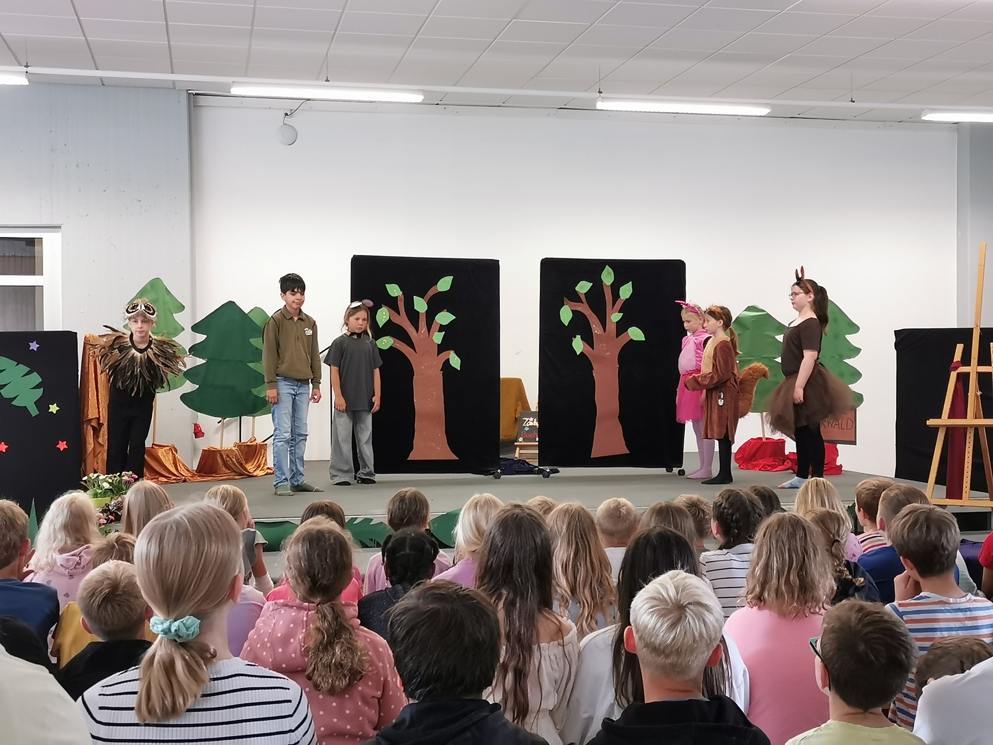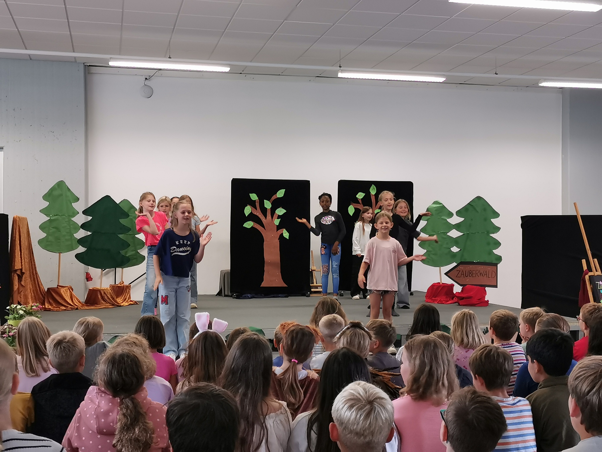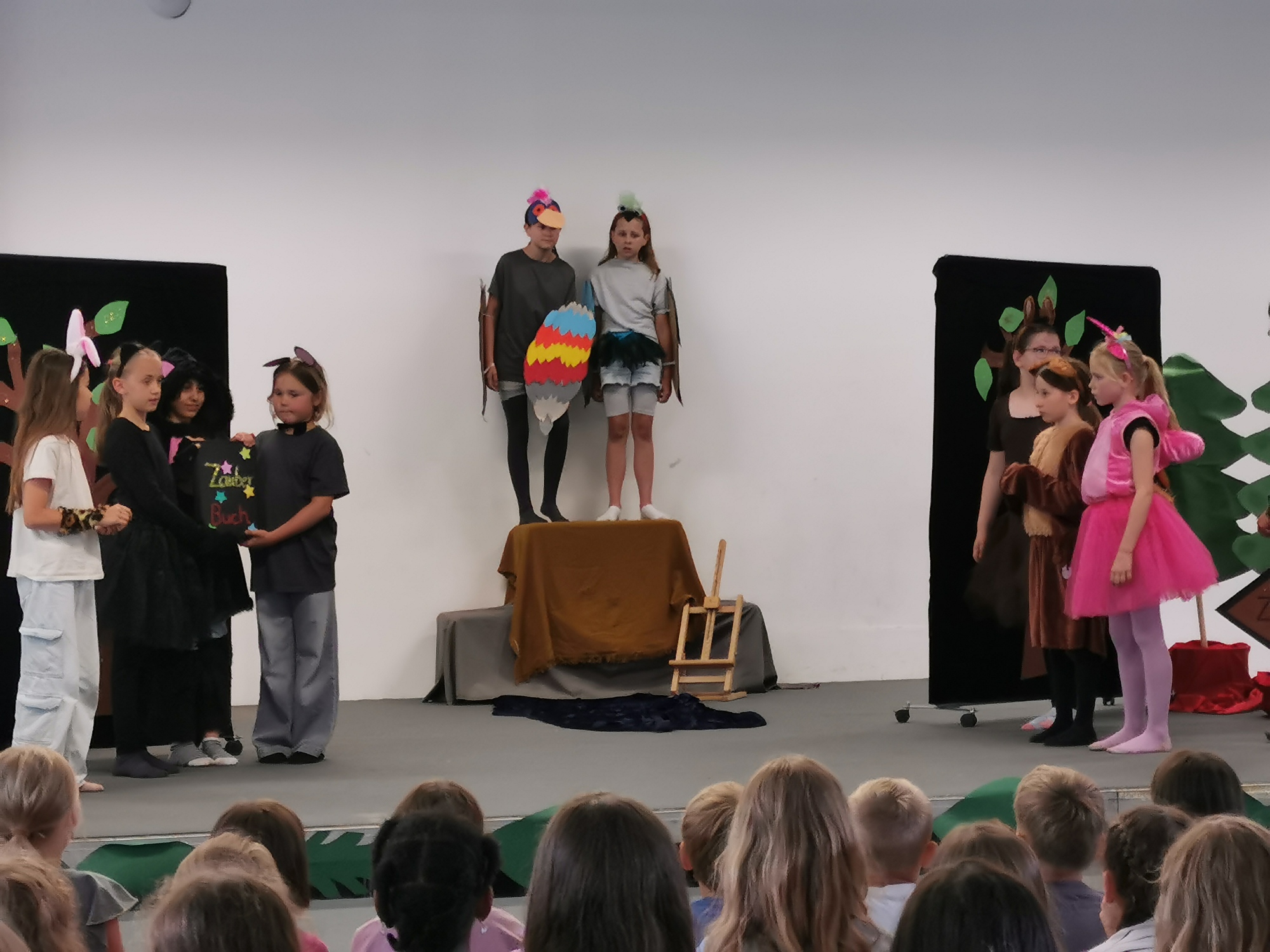 Die Theater-AG, unter der Leitung von Frau Kutzera, führte ein Stück auf, was sich um ein gestohlenes Zauberbuch drehte. Dieses wurde aus der magischen Schule der Tiere gestohlen. Die Schildkröte wurde als Täter verdächtigt und machte sich mit einigen Helfern auf die Suche nach den wahren Dieben, auch um die eigene Unschuld zu beweisen. Schließlich wurden sie bei den Vögeln fündig und konnten das Buch zurückbringen.